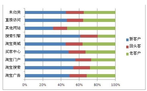 從上述圖表中,我們可以看到賣家一周內(nèi)的新客戶、回頭客、老客戶都是從不同的來源進(jìn)入網(wǎng)店的?;蛟S因搜索排名、口碑、品牌、商品展示等因素影響了消費(fèi)者的首次購買行為。細(xì)心的朋友會發(fā)現(xiàn),在上表中,回頭客、老客戶是店鋪流量的主力軍,但他們的來源又各不一樣,從其他網(wǎng)站、商城、直接訪問、買家中心來的老顧客占得較多,而且質(zhì)量也比較高。